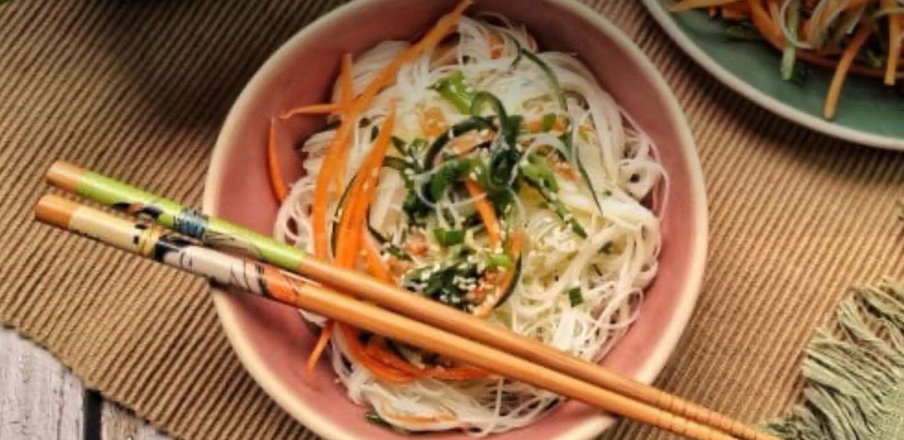 Ingredientes:250 gramas de macarrão de arroz fino2 litros de água (ou o suficiente para cozinhar o macarrão)2 cenouras (340 gramas)2 pepinos-japoneses (400 gramas)1 maço de cebolinha (80 gramas)1 maço de nirá (60 gramas)- ingredientes do molho:1 xícara de chá de azeite de oliva extra virgem1/2 xícara de chá de saquê (100 ml)1/4 de xícara de chá de vinagre de arroz (30 ml)1/4 de xícara de chá de água (30 ml)2 colheres de sopa de sementes de gergelim branco1/2 colher de chá de sal1 colher de chá de molho de pimentaPreparo:Coloque a água em uma panela grande e leve ao fogo alto. Enquanto ela esquenta, descasque a cenoura com um descascador e corte-a em tiras finas. Lave e corte o pepino em tirinhas também;Deixe uma tigela grande com água bem gelada próxima da panela com água quente. Passe o macarrão em água fervente, deixe cerca de 2 minutos e resfrie-o em seguida na tigela. Utilize uma peneira e escorra o bifum, descartando a água de cozimento. Coloque o bitum em uma tigela e acrescente a cenoura e o pepino em tiras;Para fazer o molho, em um recipiente separado, junte o saquê, o vinagre de arroz, a água, o sal, o azeite e o molho de pimenta. Misture bem, até ficar homogênea.Lave a cebolinha e o nira. Seque e, em uma tábua, fatie os dois ingredientes finamente na transversal. Coloque na tigela com o bifum, adicione o molho e misture tudo;Salpique gergelim branco por cima para finalizar. Agora é só aproveitar!
